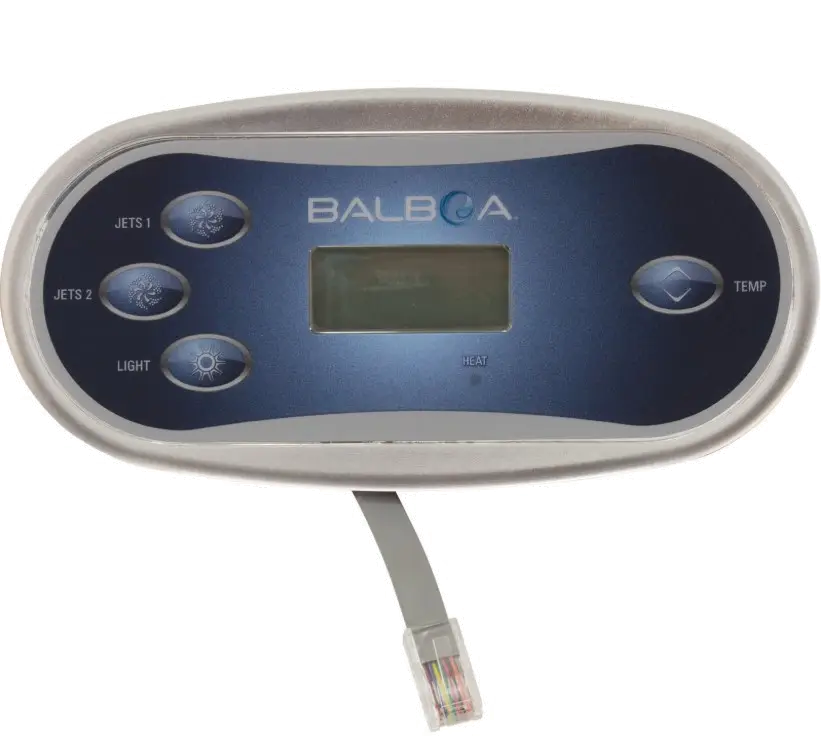 This topside control features the classic Jets / Jets / Light / Temp button configuration and comes with the correct overlay included. The panel connects to compatible spa control boards using the attached 6-foot cord, making it a direct replacement for many factory-installed spa keypads.